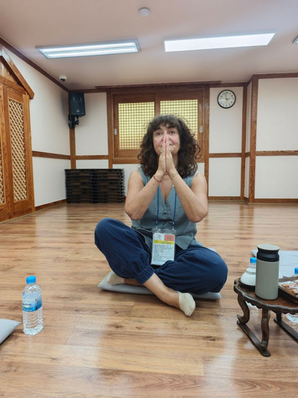 Посрещна ни служител с приличен английски, който гарнира приветствената си реч с раздаване на монашеско облекло – тъмносини памучни панталони и сив дълъг елек. А, щях да забравя, и миниатюрна хавлиена кърпа. Всеки получи нещо като бадж с номера на килията си и подробни инструкции. Казаха ни да се настаним и да се върнем за първия урок по медитация. Технологиите смело са стъпили в територията на Буда. На тъй важните за нас листчета първото беше паролата на Wi-Fi, а второто – сложното указание как да отключим вратата на стаята си, която е с шифър. Интересно защо ли е нужна такава предпазливост, след като в монашеската килия няма нищо. Буквално. Изблизан до блясък под и четири стени. Все пак различавам в стената гардероб и установявам, че вътре има тънък навит на руло дюшек, завивка и възглавница. Хвърлям сака, обличам униформата и хуквам към чаената церемония и медитацията.