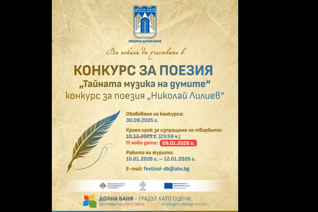 Крайният срок за участие в Националния поетичен конкурс "Тайната музика на думите" – конкурс за поезия "Николай Лилиев" е днес. Конкурсът се провежда в рамките на проект "Долна Баня – градът като сцена: Фестивал на изкуствата, словото и срещите между хората", реализиран от Община Долна баня.