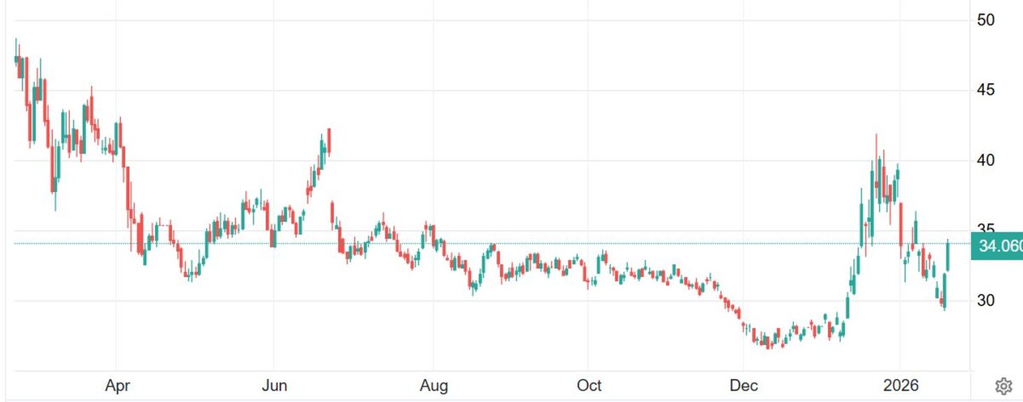 Графика на газовите TTF фючърси за март (в евро за мегаватчас)