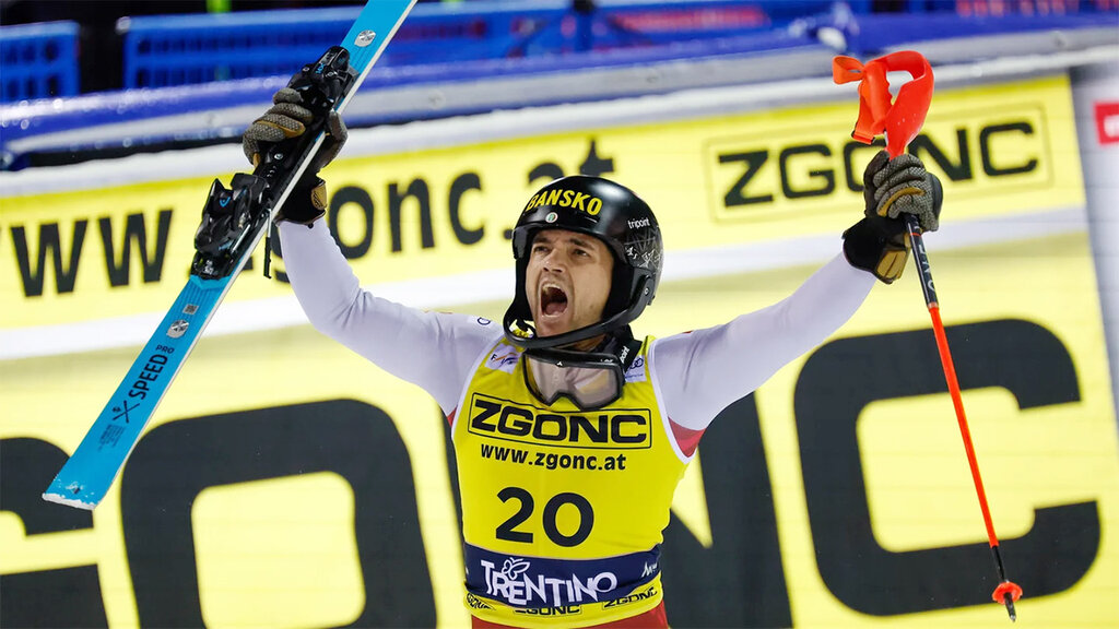 Алберт Попов ликува след победата в слалома за Световната купа в Мадона ди Кампильо